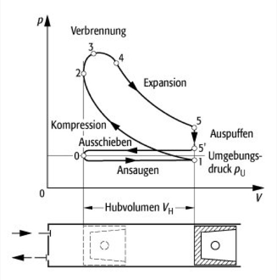 1. Takt (0-1): Aufladen des Zylinders mit Frischluft (bzw. Brenngemisch), (1-2): Verdichten der Frischluft (bzw. des Brenngemsiches), (2-3-4): Einspritzen des Brennstoffes und Verbrennung (bzw. Zündung und Verbrennen des Brenngemisches), 2. Takt (4-5): Expansion der Verbrennungsgase, (5-5'-0): Auspuffung und Ausspülen der Verbrennungsgase durch die neue Ladung.