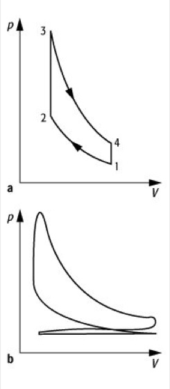 Verbrennungskraftmaschine 3:p-V-Diagramm des Verpuffungsmotors; a) vereinfachter Prozeß, b) Viertaktverfahren.