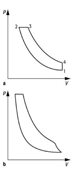 Verbrennungskraftmaschine 4:p-V-Diagramm des Gleichdruckmotors; a) vereinfachter Prozeß, b) Zweitaktverfahren.