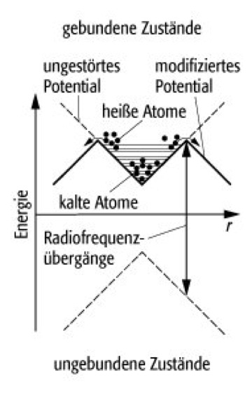 Verdampfungskühlung: Schematische Darstellung der Verdampfungskühlung in einer magnetischen Atomfalle (gestrichelte Linie: ungestörtes Potential, durchgezogen: Potential unter Einfluß des Radiofrequenzfeldes): Durch Einstrahlen eines Radiofrequenzfeldes geeigneter Frequenz werden Übergänge in Zustände induziert, die auf Grund ihres magnetischen Moments nicht von der magnetischen Falle gehalten werden. Dies entspricht einem ›Aufweichen‹ des Fallenpotentials an den Rändern wie in der Abbildung gezeigt. Die kalten Atome halten sich vorwiegend im Zentrum der Falle auf und bleiben gefangen. Heißere Atome haben eine höhere Aufenthaltswahrscheinlichkeit an den Rändern der modifizierten Falle und damit eine höhere Wahrscheinlichkeit, aus der Falle zu entkommen. Dies ist der Prozeß der selektiven Entfernung heißerer Atome. Anschließend führt die beschriebene Rethermalisierung zur Abkühlung. Durch sukzessive Verringerung der Frequenz des Radiofrequenzsenders kann die Probe immer weiter abgekühlt werden.