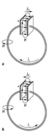 Verschiebungsstrom, elektrischer Verschiebungsstrom, das Flächenintegral der Verschiebungsstromdichte jV = ∂D / ∂t (D: dielektrische Verschiebung, siehe Abb.). Der Verschiebungsstrom wurde von J.C. Maxwell eingeführt, um das Durchflutungsgesetz zu schließen; er tritt darin gleichberechtigt neben dem Leitungsstrom auf. In einem Wechselstromkreis mit Kondensator wird der Stromkreis durch den Verschiebungsstrom geschlossen, obwohl keine Ladungsträger durch den Kondensator treten. Der Verschiebungsstrom nimmt mit ansteigender Frequenz zu, er hat daher v.a. in der Hochfrequenztechnik praktische Bedeutung. (Maxwell-Gleichungen)