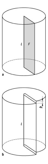Versetzungslinie 1: a) Erzeugung einer Versetzungslinie L durch Aufschneiden eines homogenen festen Körpers längs der Fläche F und b) gegenseitige Verschiebung der beiden Schnittufer (b: Burgers-Vektor).
