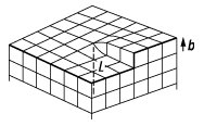 Versetzungslinie 2: Stufenversetzung im kubisch-primitiven Gitter; die Versetzungslinie L steht senkrecht auf dem Burgers-Vektor b.