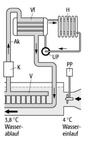 Wärmepumpe 1: Aufbau einer Wärmepumpenanlage (PP: Propellerpumpe, UP: Umwälzpumpe, H: Heizkörper, Vf: Verflüssiger, AK: Ammoniakkreislauf, K: Kompressor, V: Verdampfer).