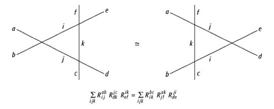 seien die Boltzmann-Faktoren an den Vertizes. Die Zustandssummen für die beiden Gitterarten sind gleich, wenn die Boltzmann-Faktoren die Yang-Baxter-Gleichung erfüllen.