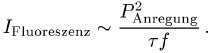 Dabei ist τ die Pulsdauer, f die Repetitionsrate bei der Erzeugung der Lichtpulse und PAnregung die mittlere Lichtleistung des Lasers. Durch die quadratische Abhängigkeit der Wahrscheinlichkeit eines Fluoreszenzereignisses von der Intensität des Anregungslichts finden Fluoreszenzereignisse praktisch nur im Fokus des Mikroskopobjektivs statt. Damit ist diese Technik der Fluoreszenzmikroskopie per se bereits konfokal, beschränkt die Beobachtung also auf einen sehr dünnen optischen Schnitt mit den typischen Vorteilen der Konfokalmikroskopie. Ein weiterer Vorteil dieser Technik liegt darin, daß bei stark streuenden Präparaten der Wirkungsquerschnitt der Rayleigh-Streuungλ-4) bei großen Wellenlängen sehr klein ist. Damit sind höhere Eindringtiefen in dicke Präparate möglich. Ein Nachteil besteht, neben der komplizierten Gerätetechnik, im geringeren optischen Auflösungsvermögen. (konfokales Auflösungsvermögen, konfokales Fluoreszenzmikroskop)