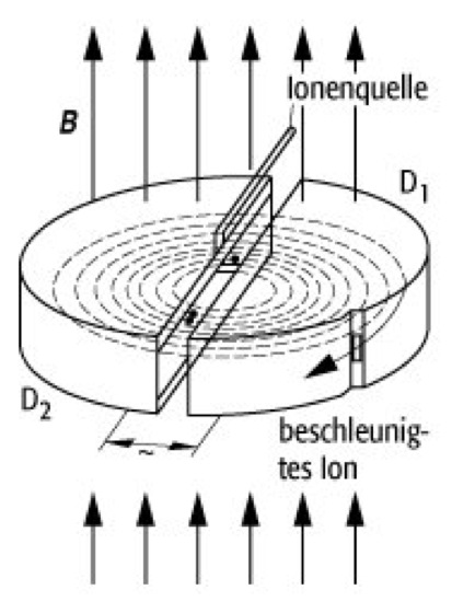 gegeben ist. Dadurch wird gewährleistet, daß die in der Mitte des Zyklotrons injizierten Ionen zweimal pro Umlauf in den Spalten der Dees beschleunigt werden, wodurch sie sich spiralförmig nach außen bewegen. Zyklotrone werden für Elektronen in Form des Mikrotrons eingesetzt.