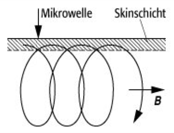 Die Zyklotronresonanz in Metallen wird auch als Azbel-Kaner-Resonanz bezeichnet. Dabei wird das Metall innerhalb eines Hohlraumresonators mit einer elektromagnetischen Mikrowelle im GHz-Bereich bestrahlt und die Absorption oder Reflexion der Mikrowelle bzw. die Oberflächenimpedanz der Metallprobe in Abhängigkeit von einem variablen Magnetfeld gemessen, das parallel zur Metalloberfläche gerichtet ist. Dabei dringt die Mikrowelle nur in eine etwa 10-5 cm dicke Schicht unterhalb der Metalloberfläche ein (Skineffekt), die bei Magnetfeldern von 0,01-0,5 T wesentlich kleiner ist als der Bahndurchmesser eines rotierenden Elektrons (siehe Abb.). Die Azbel-Kerner-Resonanz wird nur durch solche Elektronen hervorgerufen, die die Skinschicht mehrmals hintereinander durchfliegen, ohne dazwischen im Innern oder an der Oberfläche des Metalls gestreut zu werden. Deshalb ist diese Zyklotronresonanz nur in sauberen Metall-Einkristallen mit einer sehr gut polierten Oberfläche bei tiefen Temperaturen um 4 K möglich.