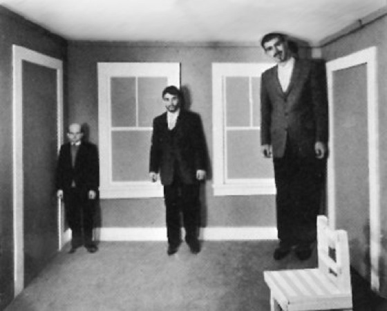 Beim einäugigen Sehen muß die Tiefeninformation aus dem optischen Umfeld erschlossen werden. Dazu benutzt der Betrachter seine Erfahrung, die ihm hier einen Raum mit rechtwinkligem Grundriß nahelegt. In diesem Fall wären die drei Personen im Raum gleich weit vom Betrachter entfernt. Die Größe der Abbildung, die die Personen auf der Netzhaut des Betrachter-Auges erzeugen, wird daher nicht nach dem Emmertschen Gesetz im Sinne der Größenkonstanz relativiert. Tatsächlich ist der Raum so konstruiert, daß die drei Personen in deutlich unterschiedlicher Entfernung vom Betrachter positioniert werden können, ohne daß dies bei einäugiger Betrachtung auffällt ( Abb. 2 ).