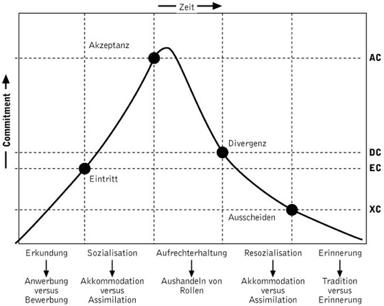 Zunächst wird in der Erkundungsphase sowohl seitens der Gruppe nach neuen, der Gruppe zuträglichen Mitgliedern gesucht als auch seitens des Individuums nach einer Gruppe gesucht, die den individuellen Bedürfnissen gerecht wird. Bei wechselseitigem Interesse steigt das Commitment zu Ende dieser Phase und leitet mit dem Eintritt des Individuums in die Gruppe den Rollenübergang zur nächsten Phase, der Sozialisation ein. Hier wird das Individuum an die Gruppennormen und Ziele assimiliert, während die Gruppe sich an die Bedürfnisse des neuen Mitglieds akkomodiert. Gelingen diese Prozesse, wird das Individuum in der Rolle als vollwertiges Gruppenmitglied akzeptiert. Während der folgenden Phase der Aufrechterhaltung werden bei konstant hohem Commitment beiderseitig Rollen ausgehandelt. Sinkt das Commitment, leitet die Divergenz den Rollenübergang in die Phase der Resozialisation über, in der beiderseitig versucht wird, das wechselseitige Commitment wieder zu erhöhen. Mißlingt dies, endet die Mitgliedschaft in der Gruppe mit dem Ausscheiden des Individuums. Den Schluß bildet die Phase der Erinnerung, die mit zur Tradition der Gruppe beiträgt. Konflikte können insbesondere dann entstehen, wenn Individuum und Gruppe ein unterschiedliches Niveau bezüglich des Commitment haben oder die Phasen und Rollenübergänge zu verschiedenen Zeitpunkten durchleben.