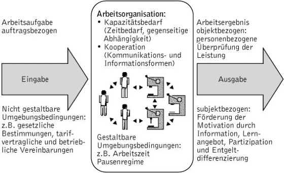 Arbeitsorganisationslehre, macro ergonomics, befaßt sich nach einer Definition von Refa (Reichsausschuß für Arbeitsstudien) mit der systematischen Gliederung und Gestaltung eines Arbeitsablaufes nach aufgabenmäßigen, inhaltlichen und zeitlichen Gesichtspunkten. Sie kann in eine aufbau- und ablauforganisatorische Komponente unterteilt werden (Ablauforganisation, Aufbauorganisation). Nicht der einzelne Arbeitsplatz (wie in der Ergonomie), sondern das Zusammenwirken mehrerer Arbeitsplätze (Makro-Arbeitssytem) ist Gegenstand der Arbeitsorganisationslehre. Ihre Zielsetzung ist, auf dieser Ebene die Erfüllung arbeitswissenschaftlicher Forderungen zu überprüfen. Die einzelnen Gestaltungsbereiche der Arbeitsorganisation erhält man, indem man sich das Einzelarbeitssystem in den größeren Kontext einer Arbeitsaufgabe, die einer Gruppe gestellt ist, übertragen denkt ( Abb. 1 ). Durch eine Analyse des Arbeitsablaufes schätzt man den Zeitbedarf für die innerhalb der Organisiationseinheit auszuführenden Aufgaben und deren gegenseitige Abhängigkeiten. Somit kann der Kapazitätsbedarf an Menschen und Betriebsmitteln und deren zeitliche Auslastung festgelegt werden. Insbesondere sind die Kommunikationswege und die dort ggf. gegebenen Reibungsverluste zu ermitteln, um die Interaktion zwischen den Mitarbeitern und den Betriebsmitteln zu optimieren. Besonders die Entwicklungen innovativer Telekomunikations- und Computertechnologien (Computer) stellen hier neue Anforderungen. Als Umgebungsbedingungen werden im erweiternden Sinne zu dem gleichen Begriff in der Ergonomie die Einflüsse bezeichnet, die sich nicht unmittelbar auf den Arbeits- und Kommunikationsprozeß auswirken, ihn jedoch mittelbar moderieren. Es ist dabei zu unterscheiden zwischen durch die Arbeitsorganisation nicht gestaltbaren Einflüssen und solchen, durch deren ablauf- und aufbaugerechte Gestaltung eine Optimierung der Kooperation erreicht wird. Auf der Ausgabenseite des Arbeitsprozesses kann durch organisatorische Maßnahmen eine Leistungssteigerung (Leistung) erreicht werden, indem einerseits personenbezogene Überprüfungsmethoden der Qualität der Arbeitsobjekte bzw. -ergebnisse entwickelt werden und anderseits durch motivierende Maßnahmen auf die Mitarbeiter eingewirkt wird.
