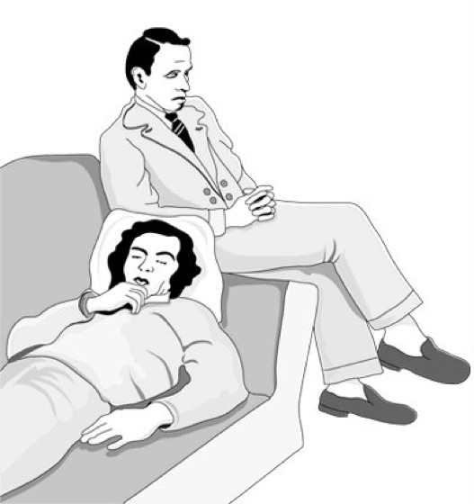 Abb. Assoziation, freie: Traditionelle Sitzposition des Analytikers in der Psychoanalyse.