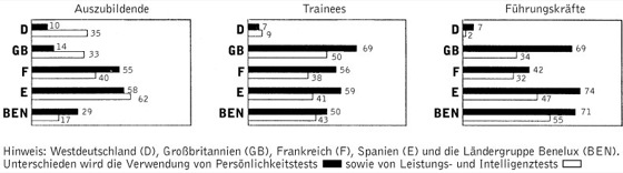 Mit psychologischen Tests, dem in der wissenschaftlich kontrollierten Eignungsdiagnostik verbreitesten Verfahrenstyp, sollen Schlüsse auf Eigenschaften der betreffenden Person oder auf ihr Verhalten in anderen Situationen gezogen werden können. Ihr Einsatz erstreckt sich auf praktisch alle Berufsbereiche und beruflich relevanten Fähigkeiten. Am wichtigsten sind: allgemeine Intelligenztests (z.B. Berliner Intelligenzstrukturtest, Berliner Intelligenzstrukturmodell), Tests spezifischer kognitiver Fähigkeiten, Tests der Aufmerksamkeit und Konzentration, Tests sensorischer und motorischer Leistung, allgemeine und spezifische Persönlichkeitstests, Einstellungs-, Motivations- und Interessentests. Bei vielen Tests handelt es sich um publizierte und über den Testhandel erhältliche Verfahren. In Großorganisationen (z. B. Arbeitsamt, Unternehmen, Militär Wehrpsychologie) werden aber auch Verfahren eingesetzt, die speziell für den betreffenden Diagnosezweck ausgearbeitet wurden. Die Einsatzhäufigkeiten bestimmter Verfahren sind abhängig von der betreffenden Berufsgruppe. Der Prozentsatz von Großunternehmen, in denen Testverfahren eingesetzt werden, unterscheidet sich in verschiedenen europäischen Ländern sehr stark (Daten von 1990; s. Abb. 3 ). Insbesondere für Tests haben computerunterstützte Verfahren (computerunterstützte Tests) starke Verbreitung gefunden.