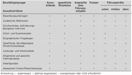 Ethische, berufsständische wie auch rechtliche Fragen der Berufseignungsdiagnostik unterliegen derzeit einer Entwicklung, die in Zusammenhang mit verstärktem Bemühen um Qualitätssicherung steht. Konkrete ethische Probleme sind beispielsweise: Verwendung unzulänglicher Diagnosemethoden, Vernachlässigung des Anforderungsbezugs, Anwendung belastender Verfahren, unbilliges Eindringen in die Privatsphäre, mangelnde Vertraulichkeit der erhobenen Daten, konfligierende Verpflichtungen gegenüber Auftraggebern und Klienten. Einschlägige Rechtsgrundlagen sind das allgemeine Persönlichkeitsrecht sowie das Arbeitsrecht (Ethik in Organisationen). Die Angemessenheit des Einsatzes eignungsdiagnostischer Instrumente in einem bestimmten Anwendungsfall richtet sich nach einer Reihe spezifischer Gegebenheiten. Sieht man von allen gegebenenfalls erforderlichen Differenzierungen ab, so kann die Nutzung diagnostischer Information für die wichtigsten Berufsgruppen vergleichend beurteilt werden ( Abb. 4 ).