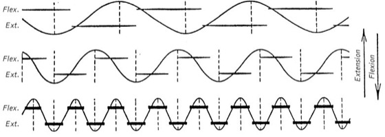 Abb. Bewegungsökonomie: Zeitliche Lage der Aktivität von Beuge- (Flex.) und Streckmuskeln (Ext.) bei Hin- und Herbewegungen mit unterschiedlichem Tempo. Bei langsamen Bewegungen endet die Muskelaktivität später als die entsprechende Bewegung; der Streckmuskel beispielsweise ist noch nach Einsetzen der Beugung (Flexion) aktiv und arbeitet dann gegen passive (elastische) Kräfte. Bei schnellen Bewegungen setzt die Muskelaktivität vor der entsprechenden Bewegung ein; der Streckmuskel beispielsweise ist schon vor Ende der Beugung aktiv und bremst sie gegen passive (Trägheits-)Kräfte. Beim mittleren Tempo werden die passiven Kräfte am besten ausgenutzt.