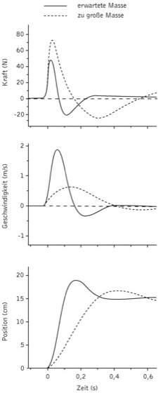 Abb. Plastizität der Bewegungssteuerung: Mittlere Kraft-, Geschwindigkeits- und Positionskurven für "normale" Bewegungen in der horizontalen Ebene (Masse von 0,5 kg) und für Bewegungen mit unerwartet großer Masse (7 kg). In der Kraftkurve zeigt sich eine sehr schnelle Korrektur (Erhöhung der Kraft), die aber nicht ausreicht. Die Geschwindigkeit fällt entsprechend zu gering aus, aber durch eine zeitliche Dehnung wird doch die richtige Weite erreicht (nach Smeets et al., 1995).