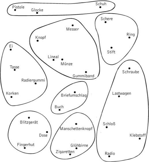 chunk, Muster, Bezeichnung für eine Einheit bzw. einen Teil der hierarchisch geordneten Wissensrepräsentation oder visuellen, räumlichen Vorstellung; Integration elementarer Einheiten zu Mustern oder Einheiten höherer Ordnung im Verlauf des Lernens. Abb. 1 zeigt eine Anordnung, wie sie in einem psychologischen Experiment zur hierarchischen Organisation von räumlichen Vorstellungen von McNamara 1989 verwendet wurde. Die Versuchspersonen betreten einen etwa 6 x 6 Meter großen Raum und sollen sich die dargestellten 28 Objekte merken. Wie viele Messungen zeigen konnten, zerlegten die Versuchspersonen den gesamten Raum in Teilräume und ordneten die Objekte in ihrer Vorstellung diesen Teilräumen zu. Die Umrandungen zeigen die hierarchische Struktur der Organisation, die eine Versuchsperson über diese Anordnung gelegt hat. Objekte desselben Chunks sind durch eine Umrandung eingeschlossen.