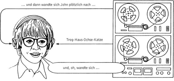 dichotisches Hören, beiden Ohren werden über Kopfhörer, getrennt nach Stereokanälen, unterschiedliche Texte gleichzeitig dargeboten ( Abb. ) mit der Aufgabe, eine der beiden Informationen zu "beschatten", d.h. nur die Wörter der einen Nachricht wiederzugeben (shadowing-Aufgabe). Ergebnis solcher "Beschattungsaufgaben ist: Es gelingt den meisten Probanden, auf den einen Text zu achten und nach Belieben begleitend nachzusprechen und den anderen Text auszublenden, nicht aber den Inhalt des anderen Textes gleichermaßen gleichzeitig zu beachten. Sie können allenfalls anschließend angeben, ob es sich um eine menschliche Stimme (männliche oder weibliche) oder um Geräusche handelte – nicht aber, was gesprochen wurde und ob bestimmte Worte häufiger vorkamen. Man konzentriert sich also auf eine Informationsquelle und filtert alles andere aus. Erklären läßt sich dieses Phänomen mit der Broadbentschen Filtertheorie (Aufmerksamkeit, Hemisphärendominanz).