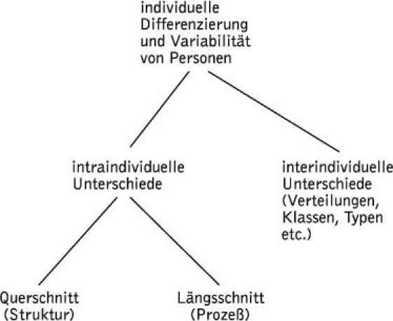 Bei der Untersuchung der Variabilität von Personen lassen sich inter- und intraindividuelle Differenzen abgrenzen ( Abb. 2 ). Primärer Gegenstand der Differentiellen Psychologie in der Sternschen Tradition sind interindividuelle Unterschiede, jedoch unter Einbezug intraindividuell gegliederter Merkmalsstrukturen bzw. zeitlich relativ stabiler Dispositionsmuster (Querschnitt) und des jeweiligen Entwicklungszustandes im intraindividuellen Zeitverlauf (Längsschnitt). Fragestellungen der Persönlichkeitspsychologie konzentrieren sich dabei auf intraindividuelle Aspekte mit dem Individuum im Mittelpunkt, d.h. vor allem auf die persönlichkeitsspezifischen strukturellen Besonderheiten von verhaltensrelevanten Merkmalsmustern (bzw. Dispositionsmustern) unter Berücksichtigung von Zeit und Situation.