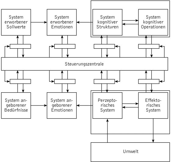 Diese deskriptiven faktoriellen Konstrukte lassen sich mit einem allgemeinen psychologischen Systemmodell verknüpfen, das nicht ausschließlich allgemeinpsychologisch begrenzt ist, sondern auch differentielle Aussagen (in Verbindung mit biologischen Aspekten) zuläßt, die nicht nur auf Erklärung durch Wirkmechanismen (Regelkreise) beschränkt sind, sondern auch teleonom-funktionale Erklärungen im Sinne von Ziel und Zweck individueller Differenzierung einbeziehen ( Abb. 3 ).