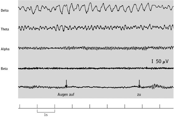Beim Menschen kann man vier Hauptfrequenzbereiche im EEG unterschieden: Alpha-Wellen (8-13 Hz), Beta-Wellen (14-30 Hz), Theta-Wellen (4-8 Hz) und Delta-Wellen (1-4 Hz). Im Wachzustand werden beim Gesunden nur Alpha- und Beta-Wellen beobachtet. Ein relatives Überwiegen von Alpha-Wellen ist kennzeichnend für Zustände reduzierter Vigilanz und geringer psychischer Anspannung. Typisch für den Schlaf ist das Auftreten von langsameren Wellen (Theta- und Delta-Wellen, letztere im Tiefschlaf) ( Abb. ).