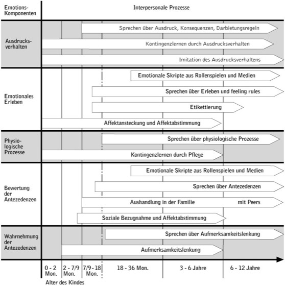 Der interpersonale Strang der emotionalen Entwicklung geht davon aus, daß Kinder seit ihrer Geburt mit anderen Menschen zusammenleben und in den Beziehungen zu diesen Bezugspersonen die meisten Emotionen erleben, ausdrücken und bewältigen. Die Qualität dieser zwischenmenschlichen Beziehungen, wie etwa die Bindungsqualität (Bindung) oder die Qualität von Geschwister- oder Peer-Beziehungen wird damit zu einem wichtigen Einflußfaktor auf interindividuelle Unterschiede in der emotionalen Entwicklung. Welche Emotionskomponenten in welchen Entwicklungsabschnitten durch welche interpersonalen Prozessen beeinflußt werden, zeigt die Abb.