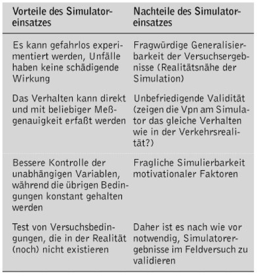 Fahrsimulation, vereinfachte Darstellung der Realität von Fahraufgaben durch ein Simulationsmedium. Die Entwicklung von Kraftfahrzeug-Simulatoren leitet sich aus der Luftfahrt ab. Heutige computerbasierte Simulatoren verwenden gängige Fahrerkabinen, verfügen unter Umständen über aufwendige Bewegungssimulation, erzeugen eine "Außensicht", die den Operationen des Fahrers weitgehend entspricht, spielen Fahrzeuggeräusche ein, etc. Trotz dieser großen Fortschritte im Vergleich zu früheren Versuchen, Verkehrssituationen mit ihren Anforderungen nachzubilden, werden sich auch in absehbarer Zukunft lediglich eher für den Außerortsverkehr typische Situationen realisieren lassen (Verkehrspsychologie). Situationen im Stadtverkehr mit realistischen Bild- und Bewegungseindrücken sind noch nicht zu erzeugen. Somit sind mit Simulatoren typische Vor- und Nachteile verbunden ( Tab. ).