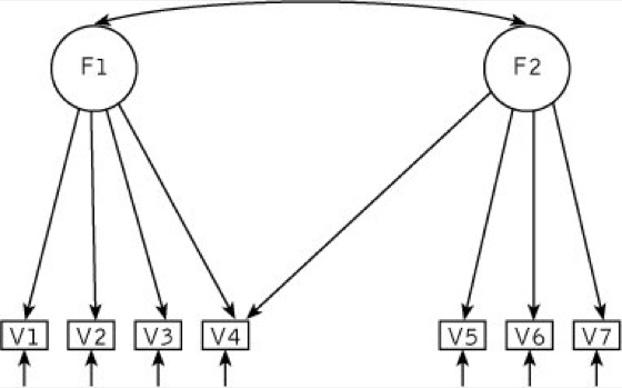 Die Kommunalitäten der Variablen – offensichtlich sind es nur diese, die für die faktorenanalytische Fragestellung von Bedeutung sind – werden im folgenden dann mittels Linearkombinationen zu Faktoren gebündelt, und zwar in der Weise, daß der erste extrahierte Faktor den größten Anteil an diesen Kommunalitäten aufklärt, der – vom ersten Faktor linear unabhängige – zweite Faktor den zweitgrößten Anteil usf. Insgesamt können dabei so viele Faktoren extrahiert werden, wie Variablen vorhanden sind. Der Clou besteht bei der Faktorenanalyse nun jedoch gerade darin, daß man – zumindest gilt dies für eine "gelungene" Faktorenanalyse – deutlich weniger Faktoren benötigt, als Variablen vorhanden sind, da von einer bestimmten Zahl extrahierter Faktoren an nur noch unbedeutende Kommunalitätenantelle aufgeklärt werden. Die Stärke, mit der ein solcher Faktor eine empirisch erhobene Variable linear determiniert, geht aus der "Faktorladung" hervor: diese liegt zwischen -1.0 und +1.0 und zeigt damit auch die (positive oder negative) Richtung an, in der ein solcher Faktor eine empirische Variable beeinflußt: sie stellt den partiellen standardisierten Regressionskoeffizienten von dem jeweiligen Faktor hin zu der empirisch erhobenen Variable dar. In der folgenden Abb. wird die von der Faktorenanalyse erbrachte Leistung graphisch veranschaulicht: Die Kästchen symbolisieren dabei die empirisch erhobenen Variablen, die Kreise die Faktoren, die von den Kreisen zu den Kästchen verlaufenden Pfeile die Faktorladungen, die Pfeile, die von unten auf jedes Kästchen zugehen, die Spezifitäten, und die gekrümmten Pfeile zwischen den Kreisen die Faktorkorrelationen; mittels bestimmter Restriktionen können hier auch unkorrellierte Faktorlösungen "erzwungen" werden. Wie man sieht, wird die 4. Variable von beiden Faktoren geladen.
