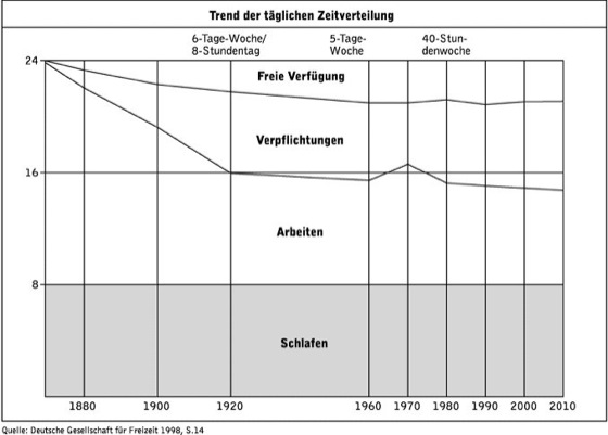 Freizeit ist zum Merkmal der Lebensqualität geworden und gilt insbesondere als Maßstab für den persönlichen Freiheitsgrad und die Teilhabe am sozialen Leben. Freizeit beinhaltet nicht nur Vergnügen, Unterhaltung und Abschalten von der Arbeit, sondern auch Bildung, politisches und soziales Engagement sowie Gesundheitsorientierung (Gesundheitsverhaltensmodelle). Entsprechend ist heute der Freizeitbegriff wenig eindeutig: Freizeit ist das, was der Einzelne für sich darunter versteht, Freizeit kann alles sein. Arbeit und Freizeit sind keine trennscharfen Lebensbereiche mehr: Arbeit kann zur Freizeit und Freizeit zur Arbeit werden. Die subjektive Wertschätzung der Freizeit, die verfügbaren Zeitbudgets und die Investition der Individuen in die Freizeit haben in den letzten 50 Jahren einen enormen Anstieg erfahren. Die Freizeitinfrastruktur ist gleichzeitig ständig ausgebaut worden. Basis für diese Sachverhalte ist, daß die Arbeitszeit trotz wirtschaftlicher Krisen immer kürzer geworden ist und die Einkommen stetig angestiegen sind. ( Abb. )