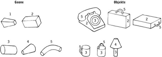 Abb. geometric ions. Einige Geone (linke Seite) und einige Gegenstände (rechte Seite), die aus den Geonen zusammengesetzt sind. Die Zahlen auf den Gegenständen geben an, um welche Geone es sich handelt. Schon mit zwei oder drei Geonen lassen sich erkennbare Objekte bilden. Dabei kommt es insbesondere auf die Relationen zwischen den Geonen an, wie die Beispiele der Tasse und des Eimers verdeutlichen.