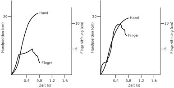 Abb. Greifen. Transport- und Greifkomponenten beim Ergreifen unterschiedlich großer Objekte in gleichen Distanzen (nach Jeannerod, 1981).
