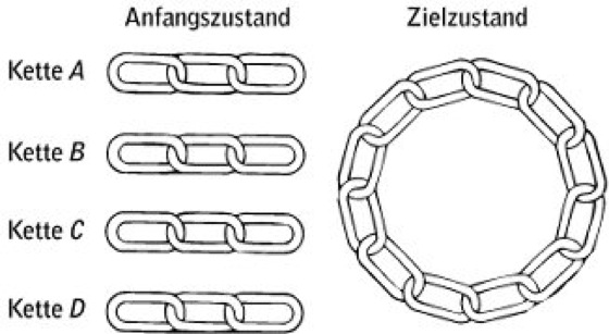 Abb. Inkubationseffekt. Das Problem der billigen Halskette: Gegeben sind vier jeweils dreigliedrige Ketten A, B, C, D. Es kostet 10 Pfennig, ein Kettenglied zu öffnen, und 15 Pfennig, es zu schließen. Zu Beginn sind alle Kettenglieder geschlossen. Das Ziel ist, alle Kettenglieder zu einem einzigen Kreis zu verbinden, wobei der Betrag von 75 Pfennig nicht überschritten werden darf.