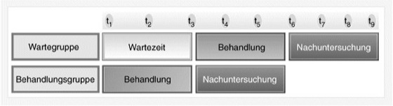 Interventionsstudien, befassen sich im therapeutischen Bereich mit der Frage, inwieweit psychotherapeutische Maßnahmen einen Einfluß haben oder den Verlauf einer psychischen/körperlichen Erkrankung beeinflussen. Die unabhängige Variable ist dabei die therapeutische Maßnahme. Im einfachsten Fall ist zwischen einer Behandlungsgruppe und Kontrollgruppe zu unterscheiden. Aus ethischen Gründen (Ethik im Humanexperiment) ist es aber nicht zu vertreten, einem Patienten eine therapeutische Unterstützung vorzuenthalten. Deshalb arbeitet man meist nicht mit echten Kontrollgruppen, sondern mit sog. Wartekontrollgruppen. Den Patienten der Wartegruppe wird erläutert, daß sie die gleiche Behandlung erhalten, wenn die Therapie der ersten Behandlungsgruppe abgeschlossen ist (zeitliche Anordnung siehe Abb. ) (Versuchsplanung).