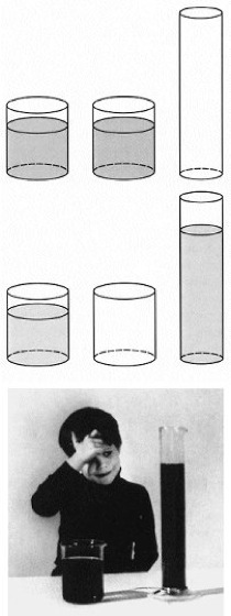 Invarianz, Unveränderlichkeit. 1) Als mentale Repräsentation die Unveränderlichkeit im Sinne von Konstanz der Größe, Farbe, Form, Helligkeit. 2) Bezugnahme auf das Wissen eines Kindes, welche Eigenschaften bei welchen Transformationen erhalten bleiben. Das Erkennen der Invarianz entwickelt sich mit dem Durchlaufen der Entwicklungsstufen nach J. Piaget. Invarianz auf der sensumotorischen Stufe bedeutet, daß das Kind lernen muß, daß Dinge trotz Transformationen in der Zeit und im Raum weiterbestehen. Viele wichtige Fortschritte im Verständnis der Invarianz treten etwa im Alter von sechs Jahren auf, was nach Piaget dem Übergang von der präoperatorischen zur konkret-operatorischen Stufe entspricht. Eine häufig gestellte Aufgabe ist in der Abb. skizziert. Man zeigt einem Kind zwei gleich große Bechergläser, die beide gleich viel Wasser enthalten. Man fragt nun, ob die beiden gleich großen Bechergläser gleich viel Wasser enthalten, und das Kind antwortet mit "ja". Anschließend wird das Wasser aus dem einen Becherglas in den Meßzylinder geschüttet. Fragt man das Kind jetzt, ob die Wassermenge in beiden Behältern übereinstimmt, so wird das Kind nun behaupten, im hohen Meßzylinder befinde sich mehr Wasser. Kinder lassen sich, so die Erklärung, in diesem Alter immer noch von irrelevanten physikalischen Eigenschaften einer Anordnung ablenken; sie werden von der "äußeren Erscheinung überwältigt".