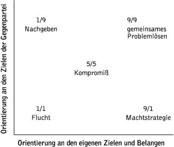 Strategie 9/1 ist ausschließlich an den eigenen Zielen und Belangen orientiert, es geht darum, sich durchzusetzen, das eigene Wunschergebnis zu erzwingen, dazu werden auch Drohungen, Macht und Pokerstrategien verwendet. Es handelt sich um eine Gewinner-Verlierer-Situation. Strategie 1/9 ist der vollständige Verzicht auf die eigenen Ziele zugunsten des Gegenspielers; man gibt dem anderen nach, läßt ihn gewähren, unterwirft sich sogar. Strategie 1/1 dient gleichfalls zur Konfliktvermeidung. Es kommt zum Rückzug auf beiden Seiten. Beide Beteiligte verzichten auf die Durchsetzung ihrer Ziele. Strategie 9/9 stellt das eigentliche gemeinsame Problemlösen dar, eine Gewinner-Gewinner-Strategie, bei der beide Parteien in optimaler Weise ihre Ziele und Belange verwirklichen können. Möglich ist dies bei einer kreativen Zusammenarbeit und dem Bemühen, eine für beide Seiten optimale Lösung finden zu wollen. Diese Strategie ist erstrebenswert, jedoch zeitintensiv. Zudem wird sie sich nicht in jeder Situation realisieren lassen – Grenzen findet sie insbesondere bei Verteilungskonflikten. Strategie 5/5 steht für den Mittelweg, d.h. den Kompromiß, bei dem jeder Beteiligte von seinen maximalen Forderungen etwas abweicht. Sinnvoll ist dies beispielsweise bei Verkaufsverhandlungen, bei denen man sich bei einem Mittelpreis trifft. Problematisch wird es, wenn eine Patt-Situation oder ein "fauler Kompromiß" entsteht, eine Situation also, bei der zwar beide Beteiligte einen Teil ihrer ursprünglichen Maximalforderung realisieren können, letztlich aber kein befriedigendes Ergebnis erreicht wird. Glasl (1999) empfiehlt verschiedene Interventionsstrategien in Abhängigkeit vom Verlauf des Konfliktes und dem erreichten Eskalationsgrad, bei denen schließlich eine dritte, neutrale Partei einzugreifen hat.