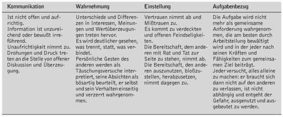 Gegenseitiges Vertrauen und Bereitschaft, sich zu unterstützen, nehmen in der Konfliktsituation ab. Dagegen werden Unterschiede und Trennendes stärker erlebt. Nicht zuletzt aufgrund der geringeren und unaufrichtigen Kommunikation werden negative Zuschreibungen stabilisiert, da sie keiner Korrektur mehr unterworfen werden. Letztlich leiden darunter auch Aufgabenbezug und damit die Arbeitseffizienz.