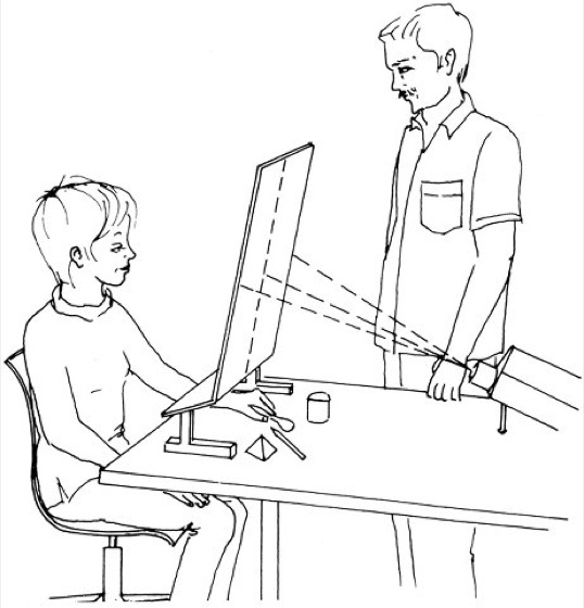 Abb. Lateralität, zerebrale. Experimentelle Anordnung für die Untersuchung lateralisierter Verarbeitung von Reizen. Visuelle Stimuli werden über Dias in die entsprechende Hirnhälfte projiziert, und die Probanden müssen die Gegenstände durch Tasten hinter einer Blende erkennen.