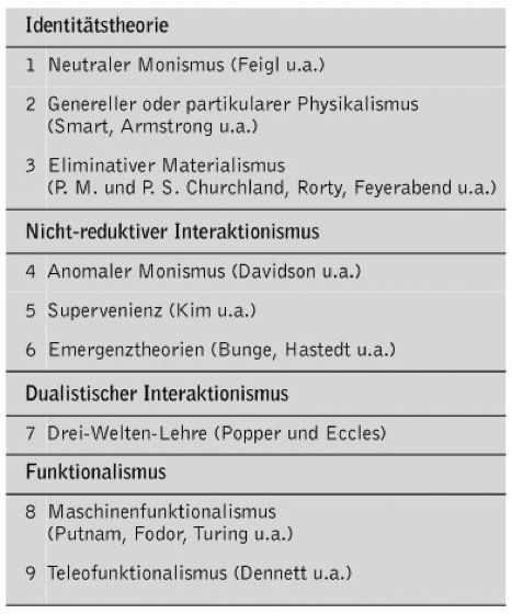 Eine systematische Klassifikation von Leib-Seele-Auffassungen durch genaue Analyse der Annahmengefüge, Relationen und Brückenprinzipien wäre möglich; hier wird nur eine grobe Typisierung gegeben. Nur mit Vorbehalten können bestimmte Autorennamen genannt werden, da oft wesentliche Unterschiede (Zusatzannahmen, Einschränkungen) existieren. Diese Typisierung kann nur als erste Annäherung dienen ( Tab. 1 ).