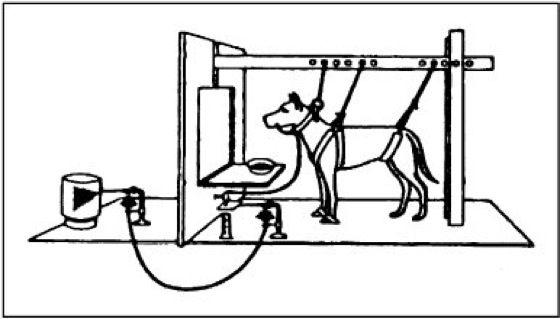 1) Das Reiz-Reaktions-Lernen: Etwa um die Jahrhundertwende untersuchte der russische Physiologe Iwan Petrowitsch Pawlow die psychische Erregung der Speichel- und Magendrüsen (Klassische Konditionierung). Die Beobachtung, daß bei hungrigen Tieren oder Menschen bereits beim Anblick von Nahrung oder sogar bei der Vorstellung von Speisen Speichel zu fließen beginnt, wurde zum Ausgangspunkt zahlreicher Lernexperimente ( Abb. 2 ).