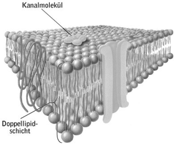Abb. Membran. Doppellipidschicht mit eingebetteten Eiweißmolekülen, die als Kanalmoleküle dienen.