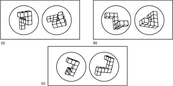 Abb. mentale Rotation. Übereinstimmende Objektpaare (a) und (b) und Fehlpaarung (c).