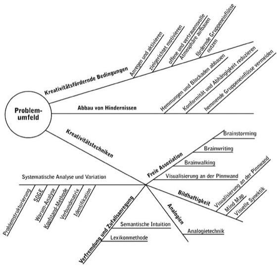 Mind Mapping, Arbeits- bzw. Kreativitätstechnik zur Strukturierung von Informationen mit Hilfe von mind maps bzw. gedanklichen Landkarten; Visualisierungstechnik bei Textverstehen, Diskussionsverläufen, Ideenentwicklung (Kreativität). Diese Arbeitstechnik läßt sich hervorragend nutzen, um Informationen aus Büchern, Zeitschriften, Gesprächen und Diskussionen zu bündeln und optisch übersichtlich aufzubereiten. Mind Maps bilden Sachverhalte netzwerkartig ab und kommen daher menschlichen Denkprozessen entgegen. Das Thema wird in der Mitte des Blattes positioniert. Ausgehend von diesem Zentrum werden auf Linien, die wie Äste oder Zweige auslaufen, weitere Gedanken oder Themen angetragen. Hauptgedanken in Schlüsselwörtern werden auf Ästen, weitere Differenzierungen auf Zweigen festgehalten, die von den Hauptästen abgehen ( Abb. ). Je differenzierter und detaillierter die Untergedanken, desto feingliedriger wird die "Baumstruktur". Zusätzlich werden visuelle Darstellungsmittel eingesetzt, wie Pfeil, Sterne und andere ikonische Symbole. Vorteile dieser Technik sind: 1) Die Hauptidee ist zentral dargestellt. 2) Die relative Bedeutung der Einzelbeiträge wird sichtbar. 3) Verknüpfungen sind dargestellt. 4) Das Erinnern wird erleichtert. 5) Neue Informationen können leicht integriert werden. Mittlerweile existieren bereits PC-Programme zum Erstellen von Mind Maps.