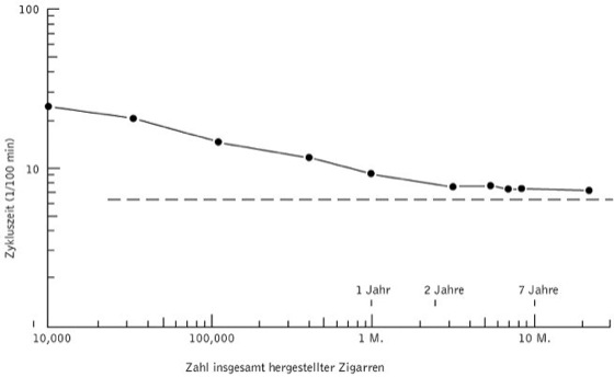 Abb. motorisches Lernen. Mittlere wöchentliche Zyklus-Zeit beim Drehen von Zigarren bei Arbeiterinnen mit unterschiedlich langer Erfahrung. Diese Daten sind eine (im Querschnitt gewonnene) klassische Übungskurve, die in doppelt logarithmischen Koordinaten linear ist (das ist eine Eigenschaft der Potenzfunktion). Eine Abweichung von der Linearität ist erst nach über zweijähriger Erfahrung zu beobachten, bedingt durch die Annäherung an eine durch die Maschine bestimmte minimale Zyklusdauer (nach Crosman, 1959).