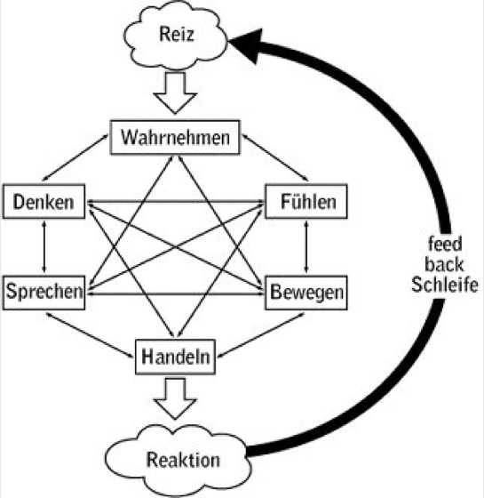 Der Zusammenhang zwischen Wahrnehmung, innerer Verarbeitung und Verhalten ist Ausgangspunkt des NLP ( Abb. ). Bei Wahrnehmen und Denken findet sich die Theorie sinnesspezifischer Repräsentationssysteme als Basis der Informationsverarbeitung und damit des subjektiven Erlebens (James) wieder. Beim Handeln spielt die Zielorientierung (Miller, Gallanter, Pribram) eine wesentliche Rolle. Für die Verbindung der Sprache mit dem Denken und Handeln nutzt NLP die Transformationsgrammatik und das linguistischeSprachmodell (Chomsky, Korzybski). Bei komplexeren Verbindungen, speziell zu (Ge-) Fühlen und (Ausdrucks-) Bewegung sind die Konzepte des Modellernens (Bandura) und der unbewußten Prozesse (Freud) hilfreich. Für die Gesamtheit der Funktionen sind systemtheoretische und kybernetische Ansätze ( z.B. Bateson) maßgeblich. Das gilt besonders für die Interaktion mit der Umwelt.
