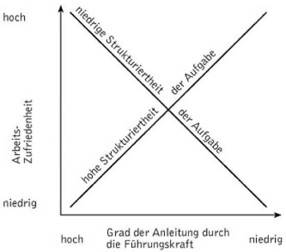 Abb. Path-Goal-Theorien. Je nach Strukturiertheit der Aufgaben und Grad der Anleitung durch eine Führungskraft steigt die Zufriedenheit der Mitarbeiter. Bei hoher Strukturierung der Aufgabe führt ein geringer Grad an Anleitung zu Zufriedenheit, bei niedriger Strukturiertheit der Aufgabe führt ein hoher Grad an Anleitung zu Zufriedenheit.