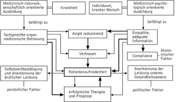 Patientenzufriedenheit, wünschenswertes Ergebnis der Arzt-Patient-Beziehung, trägt wesentlich zum Behandlungserfolg bei und ist eine wichtige Bedingung für eine positive Prognose zum weiteren Gesundungsverlauf sowie dafür, daß die ärztliche Leistung im einzelnen sowie die Leistung des Gesundheitswesens insgesamt anerkannt wird ( Abb. ). Die Zufriedenheit hängt von ganz unterschiedlichen Einflußgrößen ab, vor allem aber vom Vertrauen in die fundierte Ausbildung und fachliche Kompetenz des Arztes sowie die fachgerechte organmedizinische Betreuung (z.B. in einer Klinik), die Ängste verringert, die mit Krankheit und Behandlung verbunden sind. Einfühlungsvermögen des Arztes und seine soziale Kompetenz beim Vermitteln von Informationen fördern das Selbstwertgefühl und die Einbindung des Patienten in die Behandlung (Compliance), die wiederum zu einem guten Behandlungserfolg beiträgt (ZUF – Fragebogen zur Patientenzufriedenheit).