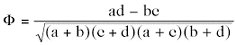 Phi-Koeffizient, auch: Vier-Felder-Koeffizient, Punktvierfelder-Koeffizient, biseriales Zusammenhangsmaß für zwei dichotome Variable. Berechnung erfolgt nach der Formel . Die Buchstaben bezeichnen die Häufigkeiten eines vier Felder-Schemas, das sich für die Kombination der beiden Merkmalsalternativen ergibt.