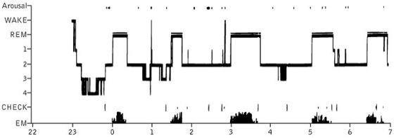 Polysomnographie, Mehrkanalerfassung des Schlafes in einem Schlaflabor, basiert auf der Simultanregistrierung des EEG, des EMG sowie des EOG. Zusätzlich können viele andere Meßgrößen erfaßt werden wie etwa das EKG, die Atmung (durch entsprechende Atemfühler an Mund und Nase, sowie Atemgurte an Thorax und Abdomen), Beinbewegungen (EMG am M. tibialis anterior), Peniserektion etc. Bei der Ganznacht-Polysomnographie gesunder Probanden ergibt sich typischerweise eine zyklische Abfolge von Non-REM- und REM-Schlaf-Stadien ( Abb. ).