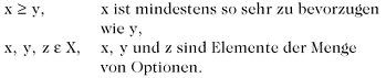 Präferenzrelation, faßt die Ziele eines Entscheidungsträgers zusammen, meistens als binäre Relation auf einer Menge X von Optionen x, y, z, ...: