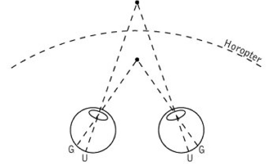 Abb. Querdisparation. Ein Gegenstand, der sich vor dem Horopter befindet, erzeugt eine Querdisparation nach temporal (G), ein Gegenstand, der sich hinter dem Horopter befindet auf der nasalen Innenseite (U).